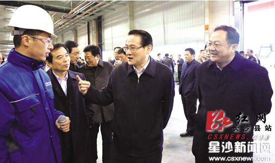 昨日,省委常委、市委书记易炼红(中)一行在上海大众长沙分公司30万辆乘用车项目实地观摩项目建设情况。曾诗怡 摄
