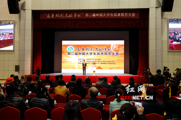 红网长沙12月14日讯(记者 陈宗昊 通讯员 刘姣)昨晚,第二届“龙神蛇形太极拳杯”中国大学生武术竞艺大赛在湖南电大举行,来自全国13所高校的近200名大学生上演了一场结合武术和艺术精髓的武术盛宴。国家教育部体卫艺司司长刘培俊,湖南省教育厅副厅长邹文辉,国务院学部委员王家宏等观看了比赛。首个出场的《中华武魂》由天津理工大学带来,表演中穿插了自选刀术、对练及缓慢、优美、和谐的太极表演,给观众展现了中华武术的无穷魅力。复旦大学上演了“功夫食堂”。表演中食堂也能成为武学潜修圣地,拉面的师傅也能变身武术高手,在面对危险时,扫把、板凳都成了趁手的武器,这都给现场观众留下了深刻印象。