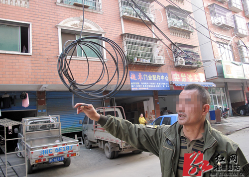 “应该是通信部门把线缠绕起来了,当时全部掉下来了。”在附近洗车行工作的曾先生告诉记者,今年八月份,此处电线杆新增了一根电缆线,因电缆线压力过大导致了下垂幅度偏大,半个月前,一辆大货车因为车身较高挂断了这根电缆线。