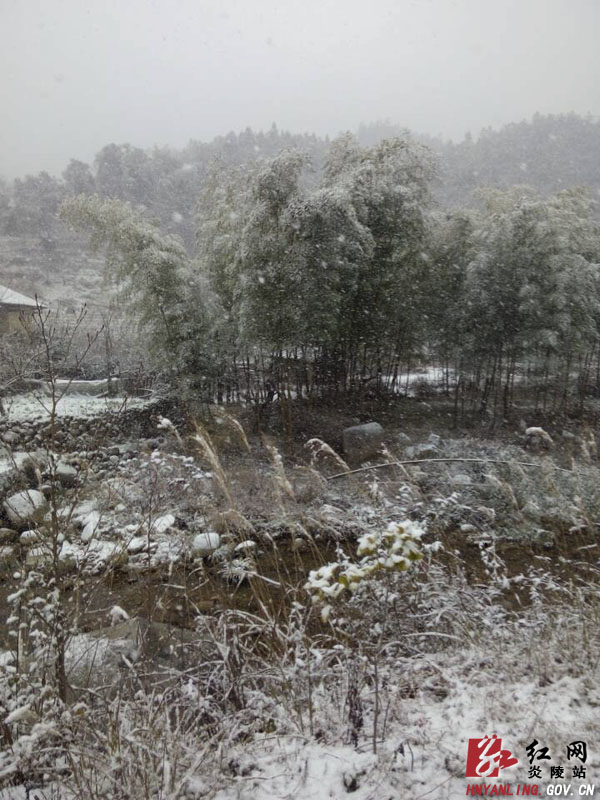红网炎陵站12月19日讯(分站记者 彭新平 通讯员 李小艳)受南下冷空气影响,12月19日,炎陵县迎来2014年冬首场降雪。下村乡银装素裹,白茫茫一片。因海拔较高,位于神农峰山脚的坪坑、田心一带降雪最大,积雪厚度已达5公分,村庄、竹林、田园全部笼罩在茫茫大雪之中,甚是少有的雪景。下村乡平均海拔1153米,比全县年平均温度低4-5℃,近日最低温度为零下4℃,若持续保持低温天气,该乡还可以欣赏到美丽雾凇景观。