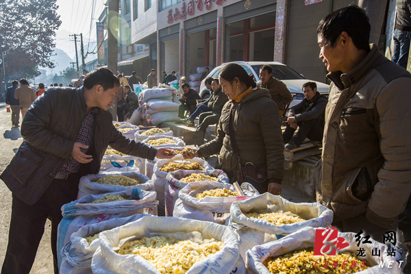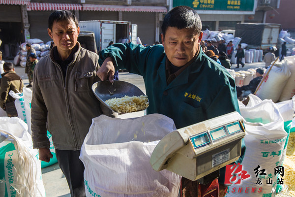12月20日,龙山县洗洛乡百合市场,买卖双方在查看百合干片品质,讨价还价。