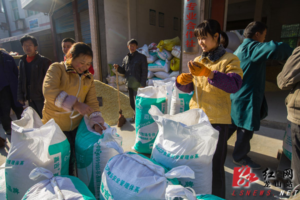 12月20日,龙山县洗洛乡百合市场,工人在给称好的百合干片进行装袋。