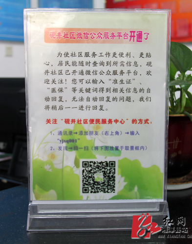 红网湘潭县站12月23日讯(分站记者 罗建)“办准生证要什么手续,小孩子什么时候要打防疫针,还有一些妇科检查通知、老人政策享受等等,在'yjsq001'上都可以及时获悉,太给力了!”自今年4月21日,易俗河镇砚井社区开通社区微信公众服务平台以来,该社区居民罗小姐第一时间关注,并成为400多“微友”中的忠实“微粉”。不仅罗小姐本人受益,她还成了社区的信息传递员,及时与邻居们分享她在微信平台上了解到的信息服务。
