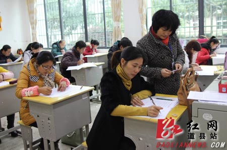 红网道县站12月29日讯(通讯员 何红福)12月27日,道县一中考场里,参加教师业务水平考试的老师在认真作答。当天,该县2000多名中小学老师和学校领导集中参加业务水平考试,监考员为学生家长和该县教育局的工作人员。近年来,该县通过开展师德师风教育和教师业务水平考试,不断提高全县教师业务水平和师德修养。