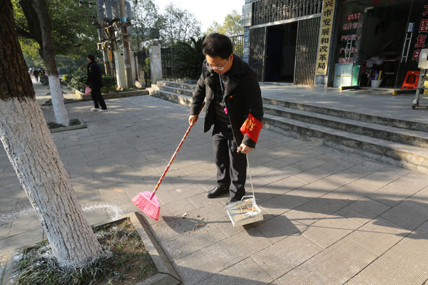 党员志愿者对城区主要干道、公共场所等地进行清扫垃圾
