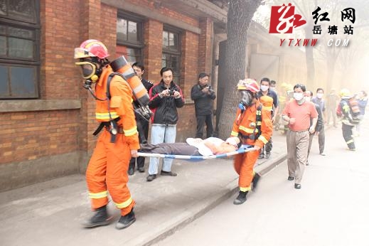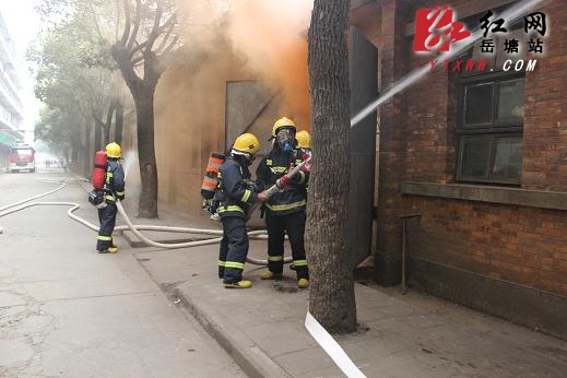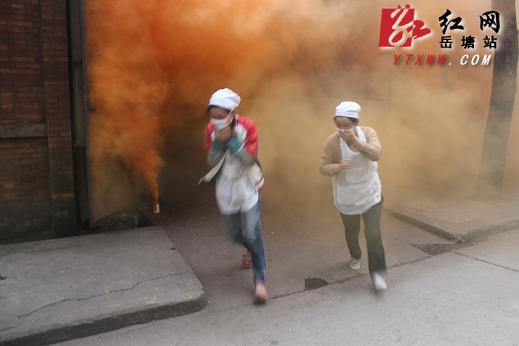 演习现场,假设湘潭东信棉业有限公司1号车间因机械故障引发火灾,致使车间内纺织品起火,火势迅速向两边蔓延,同时产生大量烟雾和有毒气体,并有数人受伤被困。