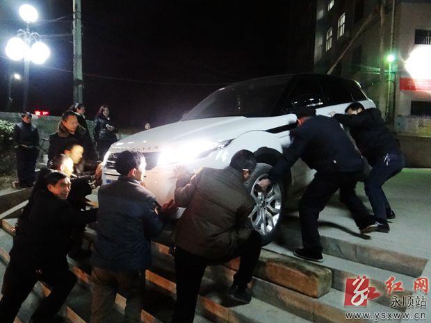 红网永顺站12月30日讯(通讯员 唐其柏)12月28日,一辆白色轿车从永顺县国税局驶出时,刹车不及,冲下门前的台阶,前胎顿时悬空。国税局工作人员和附近的群众主动帮忙解困,抬车上路,让悬空的小车化险为夷。