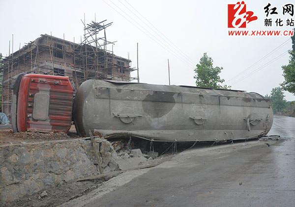 事发现场,一辆运载水泥的加长型罐车侧翻在道路一旁,驾驶员已经离开现场。