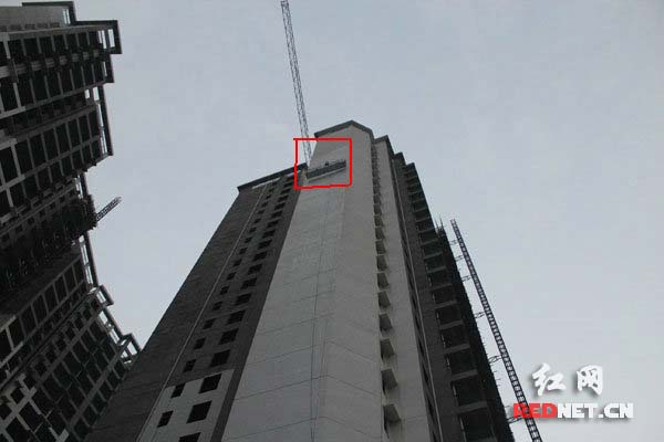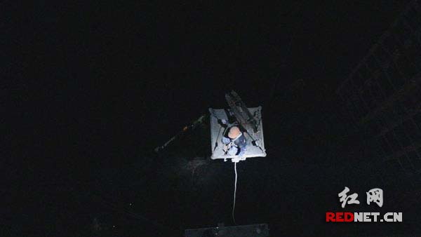 了解情况后,救援官兵携带救援器材,在工地负责人的带领下乘坐升降滑梯来到26楼。从上往下发现,身处20楼的两名工人像一个小黑点蜷缩在吊蓝中,显得那么的渺小。
