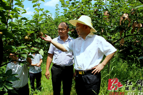 县委书记罗建南在兰蓉乡种植大户江德靖果园查看苗香梨长势情况。