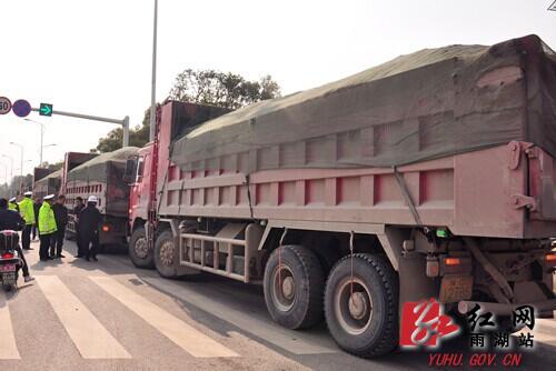 红网雨湖站1月23日讯(分站记者 谢岳峰)1月22日上午,雨湖区副区长匡龙与区治超办相关负责人途径潭锰路时,发现有3辆超限超载的货车由锰矿往桃园路口方向行驶,随即联系交警部门在桃源路口处对3辆货车设卡拦截。