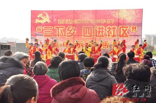 据了解,雨湖区“三下乡,四进社区”活动举办至今已有十余年的历史,2015年活动将进入全区所有乡镇街道,丰富和满足群众的精神文化需求,把优质、便捷的“惠民套餐”送到群众的家门口,让他们充分感受到党和政府的关怀、温暖。