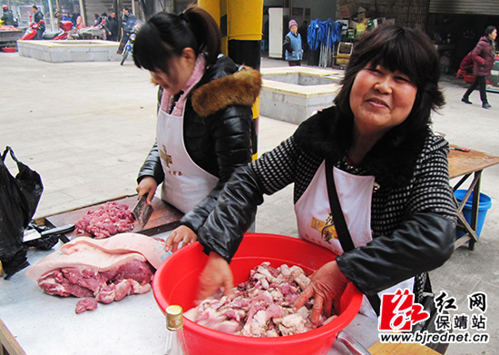 1月24日上午,记者在保靖县万家超市门口看到一家代灌香肠的摊位忙得热火朝天,前来代灌香肠的市民络绎不绝。市民自己将购买的猪肉与调料带到摊位加工,摊主马上进行切片、拌料、绞肉、灌肠、打孔、打结等程序,在他们娴熟的手法中,一根根香肠很快就加工完成,随后交给市民带回家中进行晾晒风干或烟熏,约15天后就可食用。由于整个加工过程都在现场制作完成,大家都说亲手制作的香肠更有味道,也比较安全放心。