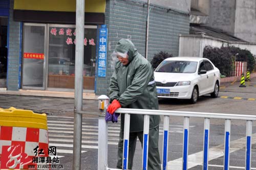 红网湘潭县站1月30日讯(分站记者 齐骏)“天气虽然不是很好,但我们都戴上了手套,干活一点也不冷。”在大鹏路,环卫工郭秋元正在认真仔细地清理护栏。