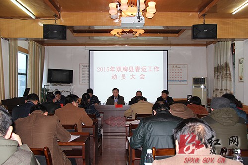 红网双牌站2月5日讯(通讯员 绪华)2月4日上午,双牌县在县交通局会议室召开2015年双牌县春运工作动员大会,双牌县委常委、统战部长、副县长李长于出席会议并作重要讲话,各乡镇场以及相关责任单位负责人参加会议。