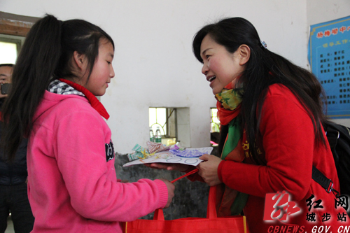 “除了衣服,还有耳罩、手套、明信片、大红福字,以及好多的学习用品。”孩子们拿到红色袋子后,迫不及待地翻看着里面装着的东西。学生触摸着梦想成真的漂亮衣服,脸上绽放着花一样的笑容。看到这么多兴奋的孩子,杨梅坳小学校长雷干红感慨万分,“山里孩子过年能穿上新衣服了!真心感谢长沙快乐公益,给我的92个孩子带来了幸福和快乐!”