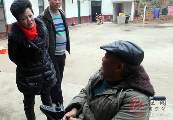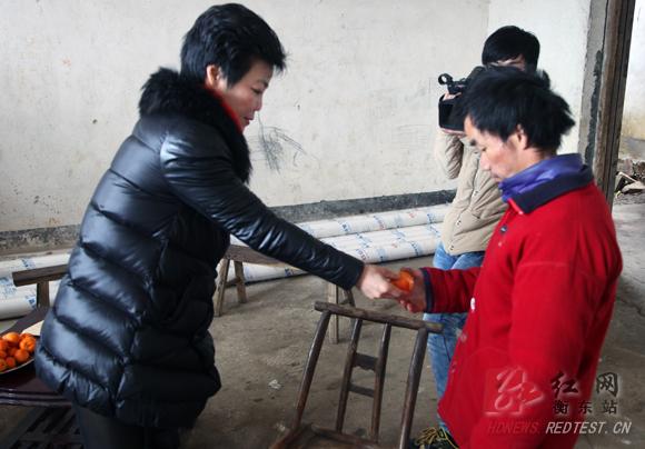 图:在白莲镇谭家桥2组,谭春兰将桔子剥好递给因先天一级智残导致生活不能自理的慰问对象手中