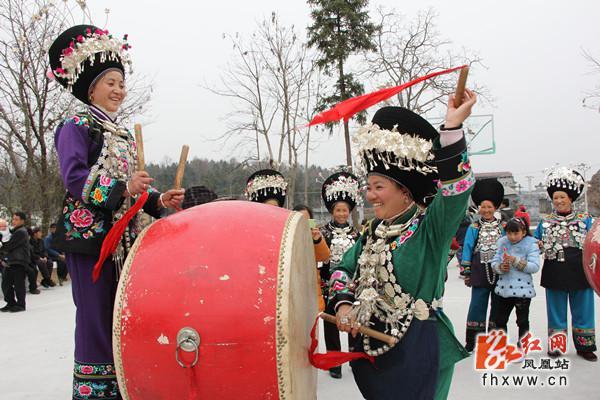 球场中央,打鼓的苗家阿妹边打边跳,不仅沉稳中透着灵气,而且纤细中显出坚韧,舞姿刚劲豪放、恣肆昂扬,时而如清澈的山溪,轻快酣畅地流淌,时而如沉厚的大河,气势磅礴……
