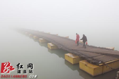 2月12日上午,湖南永州道县县城大雾弥漫,群众从红军渡浮桥上经过。