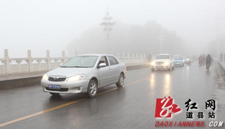 2月12日上午,湖南永州道县县城大雾弥漫,路上行车开启雾灯缓慢行驶。