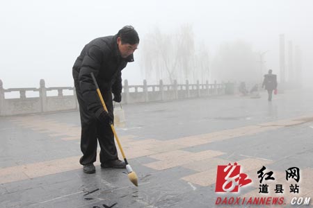 2月12日上午,湖南永州道县县城大雾弥漫,一位书法爱好者在周敦颐文化广场地上练习书法。