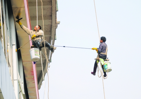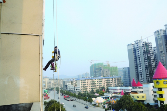 两根成人拇指粗细的尼龙绳从楼顶垂到地面,高空作业人员汪师傅和鲁师傅“人”悬一线。19层的高楼,只见两位师傅轻轻一点,把吸盘固定在了墙上,刷子往绑在身上的水桶里蘸了蘸———仰手、俯身、一刮、一抹,几米见方的玻璃外墙洁净如新。