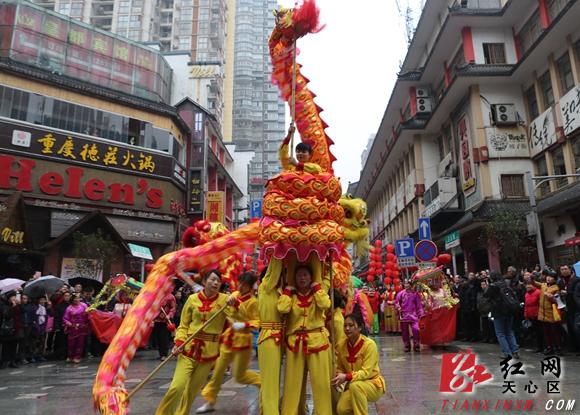 红网天心站3月5日讯(分站记者 徐拓)你有多少年没有在城市街道上看到过龙狮巡游?3月5日,正值中国传统元宵佳节,2015年长沙火宫殿大庙会完美收官,带来一场全民互动的喜庆盛会。上午9点58分,200人的巡游方阵从太平老街出发,由威风锣鼓队打头阵,以气势非凡的击打大鼓方式热闹开场,大头娃娃、蚌壳精等多支队伍依次进入太平街巡游。巡游方阵穿过解放西路,走过三王街、坡子街,最终到达火宫殿。腾龙舞狮,鼓声震天,引来市民全家老小一起“看热闹”。