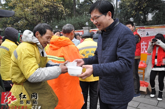 图为湘市委常委、宣传部长李孟阳为工作一线的环卫工人送汤圆。