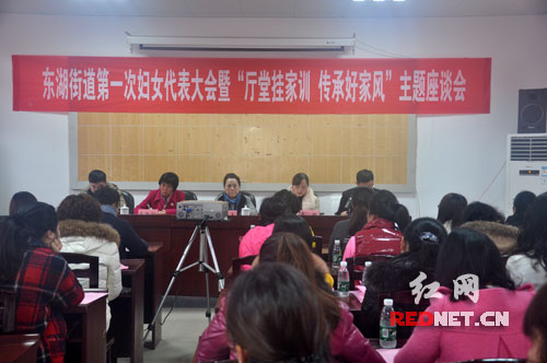 (3月8日,芙蓉区东湖街道举行了第一次妇女代表大会暨“好家风好家训”分享座谈。)