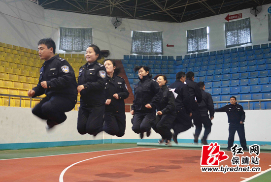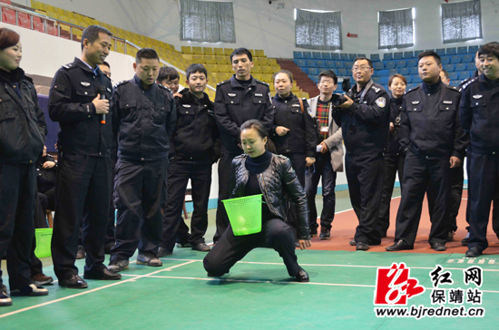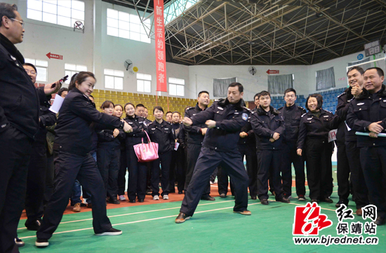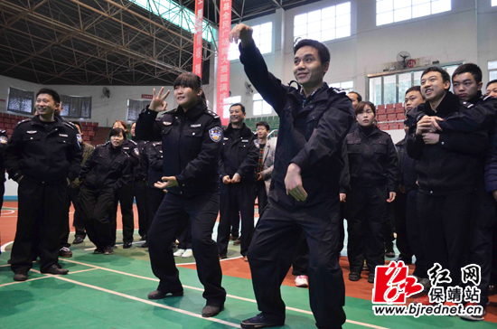 副县长、县公安局局长李军和民警一起比划动作