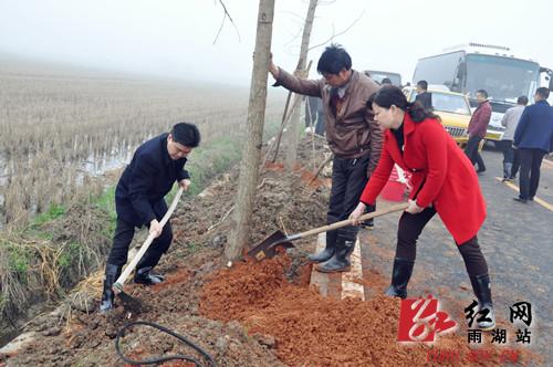 挥锹铲土、扶直树苗、培实新土、提桶浇水……植树现场大家热情高涨,每道工序都做得仔细认真。经过两个多小时的紧张劳动,大家成功栽下了80棵银杏树,这两排树也成了姜畲农业示范区观光大道上一道亮丽的风景。