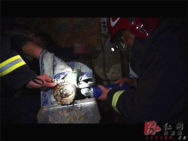 到达现场后,消防官兵发现该男子脸色苍白,中指和无名指卡已被绞肉机的绞片中“卡死”,由于剧痛难忍,汗水已湿透了身上的工作服。经过观察后,消防官兵决定先利用平口钳、扳手等工具将绞肉机的后侧破拆。拆卸完成后又将绞肉机固定住,随后用砂轮对绞肉机齿轮处进行横向切割。