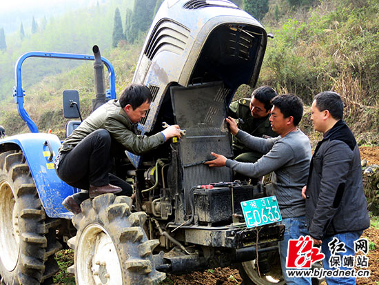 保靖县农业局农机技术人员到阳朝乡裕民农机专业合作社检修农机。