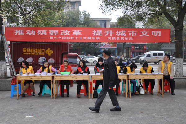 红网沅陵站3月18日讯(分站记者 邓永松 通讯员 张明锋)3月17日,沅陵开展“国际社工日”宣传活动,民政局组织干部和20多名志愿者、义工,上街宣传殡葬改革政策,让市民了解沅陵县殡仪服务项目及收费标准。