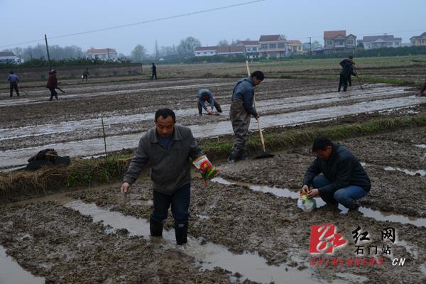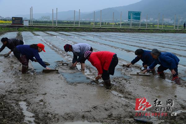 “现在搞粮食生产效益还可以,政府'买单'给我们种粮大户进行补贴,家庭农场种一亩粮食补助100元,从去年起连补三年,政府采购服务供应商——湖南杰豪种业公司负责把谷种催芽'破胸'了送到我们手上,还有软盘、营养剂等,技术服务送下田,我们农民种稻基本不用多管事了,这不是种'懒汉'稻吗?”蒙泉镇国欣家庭农场主张国欣,边说边算账,去年,他承包了106亩田,赚了5万多元。今年,他又流转邻居们的土地,增加了110多亩水稻,“今年赚钱应该能翻番了……”他笑着说。大家种田的积极性高涨,白洋湖居委会去年种粮50亩以上的大户有70多个,今年增加了40多户,承包田地占到总面积的10%以上,大大提高了土地利用率和规模效益。整田,活泥,撒营养剂,摆盘,拌种剂,撒种,施水,盖膜,农田里热闹非凡。大伙说,赶这两天天气睛好,赶快把种子撒下去。石门县农业局相关负责人和技术员们来到现场指导谷种发放和育秧,“一袋芽谷播一亩二分田,一亩田72个软盘、2包种子处理剂。”农民们纷纷赶来,向他们询问早稻种植技巧,都一一得到了满意回答。