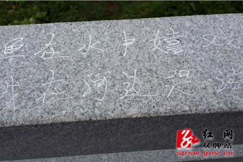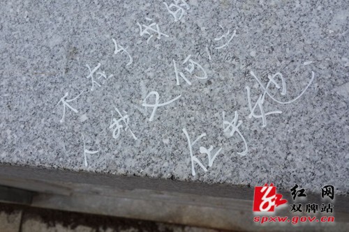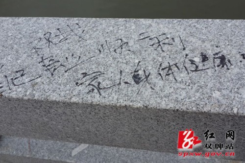 红网双牌站3月24日讯(通讯员 唐娟)阳春三月,和风送暖,沿江风光带成排的杨柳迎面拂动,休闲市民在人行道上散步游玩,一派春意盎然的景象。3月23日下午,笔者来到双牌县城沿江风光带,惊奇发现沿江风光带护栏的扶手上用油性笔写着不少祝福语和表白道歉的话语,文化石栏上人为地画上了许多“涂鸦”之作。这让如画的风光带顿时大煞风景,也给文化的长廊显得不文明,令笔者和热爱双牌的市民朋友们唏嘘不已。一位老大爷见笔者正在对这各种“涂画”进行拍照,就上前跟笔者攀谈起来。“这种乱涂乱画是一种非常不文明的行为,这么漂亮的风光护栏,一些“涂手”也舍得下手,真是太没素质了。”