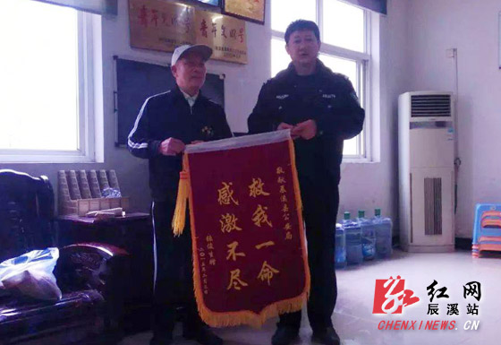 红网辰溪站3月27日讯(通讯员 孙海波)3月24日,刚刚病愈出院的张俊生老人在亲友的陪同下,手拿锦旗来到辰溪县公安局巡特警大队表达对民警的感谢之情。