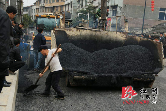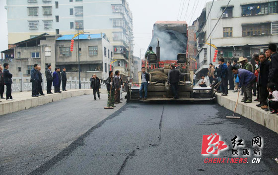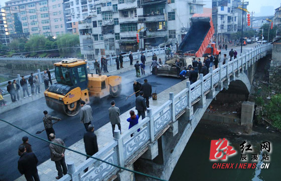 红网辰溪站3月31日讯(分站记者 张文竹 通讯员 刘本畅)3月26日,记者在辰溪县城内的观澜桥看到,10余名施工人员正在对桥上的路面进行升级改造,在原来的水泥路面上增加一层沥青路面。