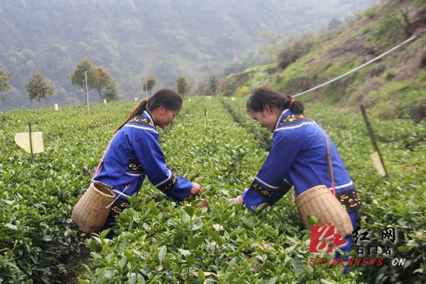 从江西和贵州嫁到石门雁池西山垭良种茶基地的妯娌林秀(左)、高华芬,一边采茶,一边唠家常。她们的丈夫周忠武、周忠文是一对双胞胎呢!“在外打工,加班的话每月3000元左右的工资,在家里种茶,一亩有近万元收入。我们家有3亩多茶园呢!”