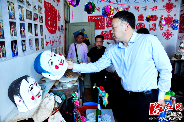 麻阳县委书记李卫林在麻阳县纸扎艺人何应标家中欣赏纸扎工艺作品