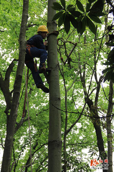 梧桐树的树干很光滑,工作人员爬得很艰难!