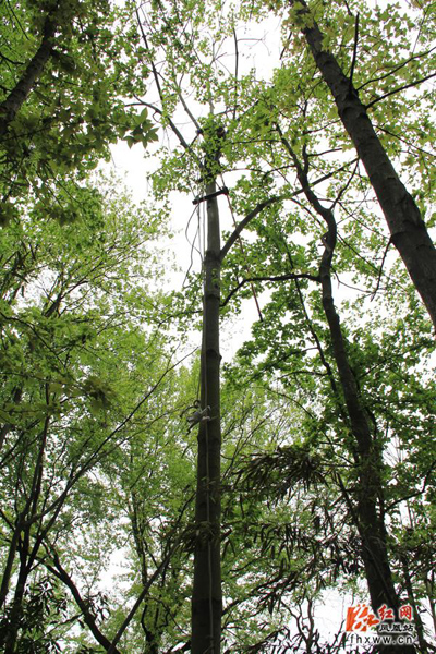 凤凰县电力公司人员到来之后认为,为了保证设备不受损坏,最好的办法只有爬树。