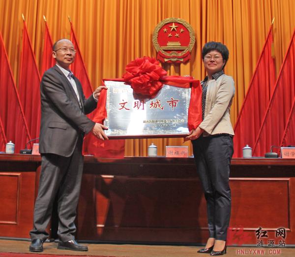 受省委文明委委托,娄底市委宣传部副部长谢福兴(前排左一)授予涟源市“2014届湖南省文明城市”奖牌。涟源市委副书记、市长谢学龙(前排右一)接受奖牌。