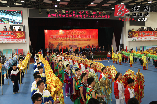 红网长沙4月24日讯(分站记者 姚泽子)4月24日,第三届中国中学生舞龙舞狮锦标赛暨2015年全国舞龙舞狮进中小学工作研讨会在望城区师大附中星城实验中学拉开帷幕。开幕式上,来自全国各地的12支中学生舞龙代表队一一亮相,他们将在教学双龙、规定套路、自选套路等舞龙竞赛中展开激烈角逐,其中师大附中星城实验中学将代表望城区参赛。随着点睛仪式的结束,12条彩龙宛若从沉睡中苏醒,焕发出蓬勃生机,在选手的跳跃腾挪间变幻出“中国龙、中国梦”等字样的造型。