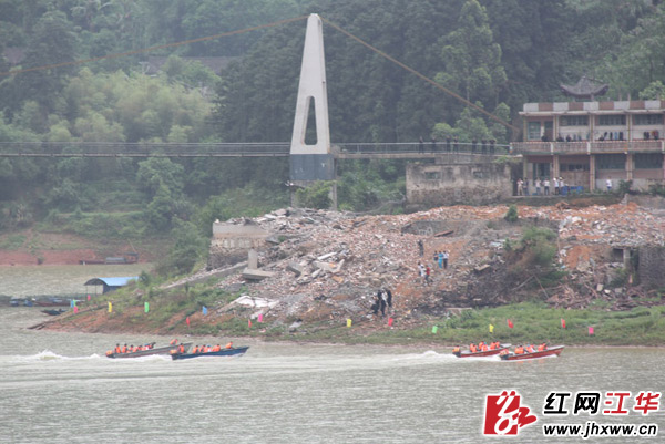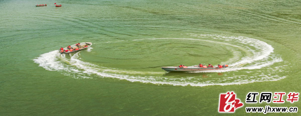 4月28日下午,永州市2015年度防汛应急实战综合大演练江华县涔天河江面演练现场。