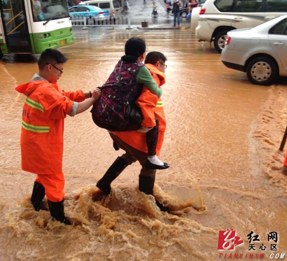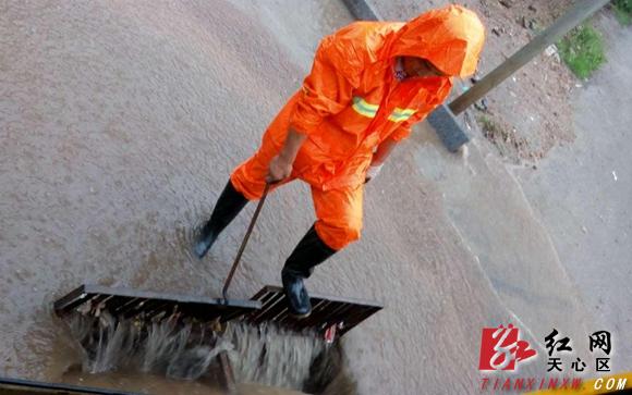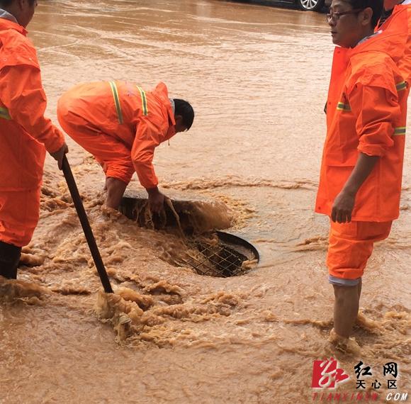 红网天心站5月8日讯(分站记者 唐媛)据省气象台消息,五一暴雨后,新一轮强降雨将于5月7日至8日到来,天心区进一步落实省、市关于继续深入开展防汛工作的安排部署,全区各级各部门按照《2015年天心区防汛应急预案》要求迅速到岗到位,强化值班值守,提前做好应急处置各项准备工作。区市政局为牵头单位的区城区强降雨天气防洪排渍工作指挥部实行领导包片联点,全员上路,252人彻夜值守在易渍点。5月8日上午8时,暴雨如期而至,天心区各级各部门迅速按照部署有条不紊地进入迎战模式,发现积水堵点后立即通过疏通、打开井盖导流、不间断抽水等方式及时处置。其中,劳动路仰天湖路段因地铁施工排水管道破裂导致大量泥沙水外涌,造成劳动路东往西大面积积水。天心区市政局迅速反应,联系自来水公司关闭水管总闸,在积水路段设置标示标牌,现场值守阻止车辆及行人进入积水区域,同时打开各处下水井盖、泄水井加快排水。截至5月8日上午11时,共处置劳动路仰天湖路段、五一大道桥头大市场、雀园路书香路口、坡子街后街、湘江大道等10余处积水点。天心区辖区所有城区积水地段积水处置完毕,未出现险情。