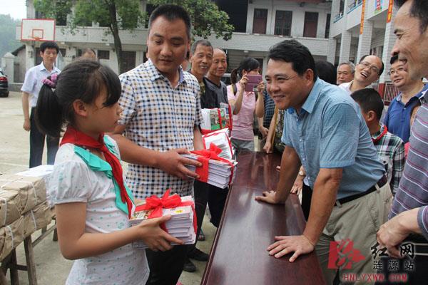 毕华(右二)在科普扶贫献爱心捐赠活动中与芙蓉学校在校学生交谈,了解他们的生活和学习情况。