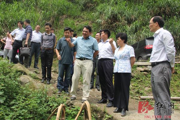 省科协党组书记、常务副主席毕华(左三)在娄底市委常委、宣传部长伍美华(右二),涟源市委常委、组织部长、统战部长朱桂良(右一)陪同下,在蓉峰村考察调研建设扶贫。