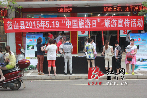 此次活动结合2015年中国旅游日“新旅游、新常态”的活动主题,按照“全民参与、公益惠民、突出主题、因地制宜、节俭高效”的原则积极营造浓厚的节日氛围。通过悬挂横幅、发放宣传资料、现场咨询等方式积极引导游客文明旅游、安全出游、理性消费。集中展现了蓝山旅游人奋发向上、团结一心的精神风貌;宣传了蓝山厚重的旅游文化资源。