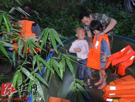20日晚7时30分左右,道县民兵在祥霖铺镇迟竹源村,转移被洪水围困的村民,给小孩穿上救生衣